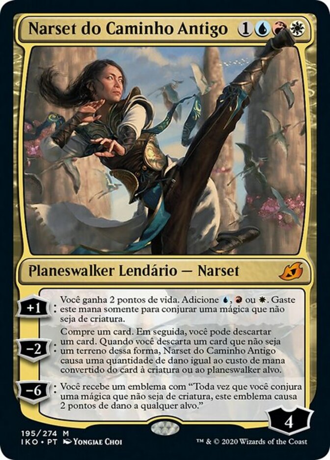 | Rules | +1: You gain 2 life. Add , , or . Spend this mana only to cast a noncreature spell. −2: Draw a card, then you may discard a card. When you discard a nonland card this way, Narset of the Ancient Way deals damage equal to that card's mana value to target creature or planeswalker. −6: You get an emblem with "Whenever you cast a noncreature spell, this emblem deals 2 damage to any target." |