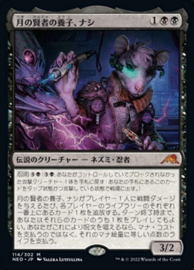 | Rules | Ninjutsu (, Return an unblocked attacker you control to hand: Put this card onto the battlefield from your hand tapped and attacking.) Whenever Nashi, Moon Sage's Scion deals combat damage to a player, exile the top card of each player's library. Until end of turn, you may play one of those cards. If you cast a spell this way, pay life equal to its mana value rather than paying its mana cost. |