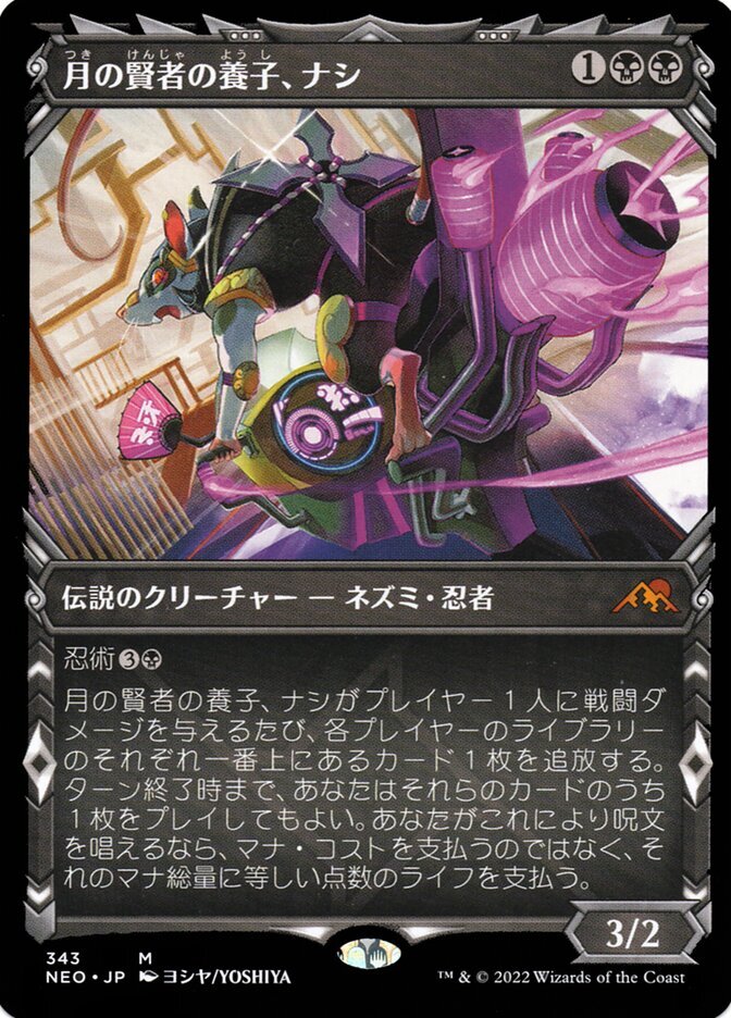 | Rules | Ninjutsu (, Return an unblocked attacker you control to hand: Put this card onto the battlefield from your hand tapped and attacking.) Whenever Nashi, Moon Sage's Scion deals combat damage to a player, exile the top card of each player's library. Until end of turn, you may play one of those cards. If you cast a spell this way, pay life equal to its mana value rather than paying its mana cost. |