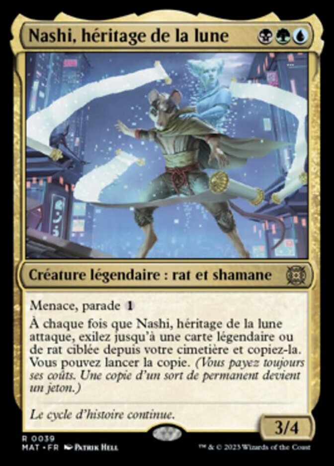 | Rules | Menace, ward Whenever Nashi, Moon's Legacy attacks, exile up to one target legendary or Rat card from your graveyard and copy it. You may cast the copy. (You still pay its costs. A copy of a permanent spell becomes a token.) |