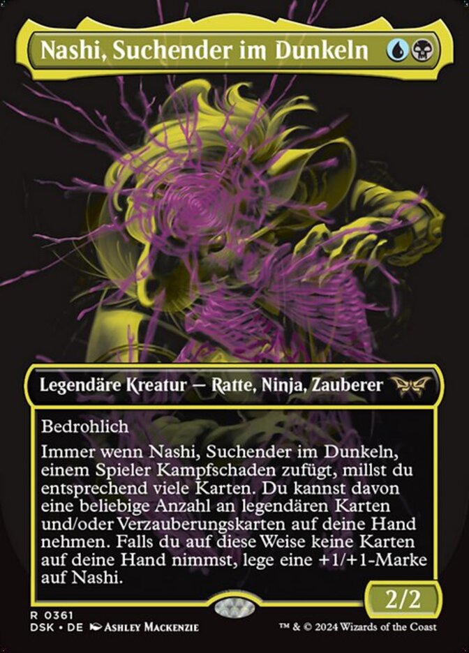 | Rules | Menace Whenever Nashi, Searcher in the Dark deals combat damage to a player, you mill that many cards. You may put any number of legendary and/or enchantment cards from among them into your hand. If you put no cards into your hand this way, put a +1/+1 counter on Nashi. |
