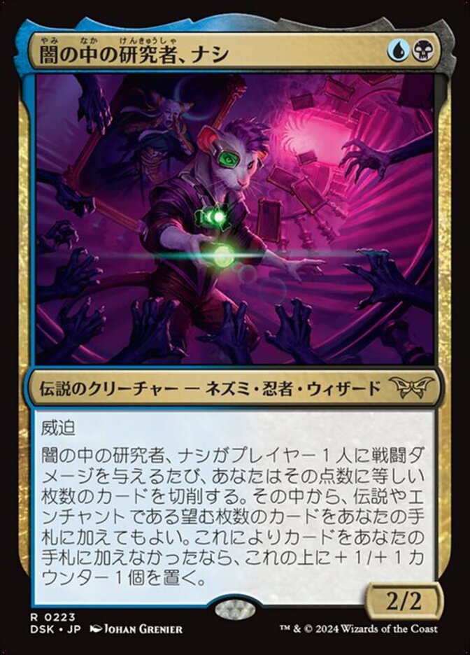 | Rules | Menace Whenever Nashi, Searcher in the Dark deals combat damage to a player, you mill that many cards. You may put any number of legendary and/or enchantment cards from among them into your hand. If you put no cards into your hand this way, put a +1/+1 counter on Nashi. |