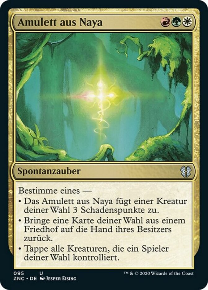 | Rules | Choose one — • Naya Charm deals 3 damage to target creature. • Return target card from a graveyard to its owner's hand. • Tap all creatures target player controls. |