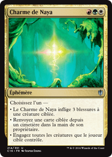 | Rules | Choose one — • Naya Charm deals 3 damage to target creature. • Return target card from a graveyard to its owner's hand. • Tap all creatures target player controls. |