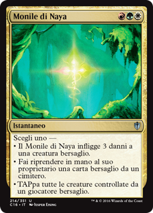 | Rules | Choose one — • Naya Charm deals 3 damage to target creature. • Return target card from a graveyard to its owner's hand. • Tap all creatures target player controls. |