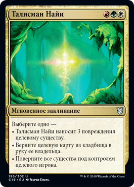 | Rules | Choose one — • Naya Charm deals 3 damage to target creature. • Return target card from a graveyard to its owner's hand. • Tap all creatures target player controls. |