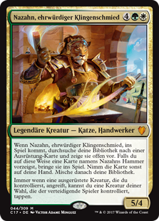 | Rules | When Nazahn, Revered Bladesmith enters the battlefield, search your library for an Equipment card and reveal it. If you reveal a card named Hammer of Nazahn this way, put it onto the battlefield. Otherwise, put that card into your hand. Then shuffle. Whenever an equipped creature you control attacks, you may tap target creature defending player controls. |