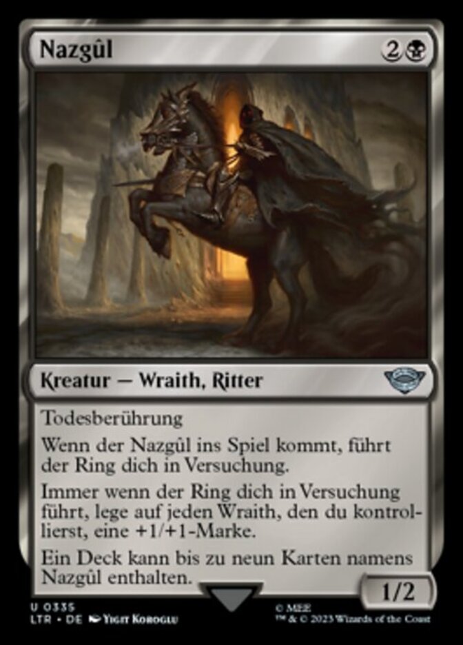 | Rules | Deathtouch When Nazgûl enters the battlefield, the Ring tempts you. Whenever the Ring tempts you, put a +1/+1 counter on each Wraith you control. A deck can have up to nine cards named Nazgûl. |