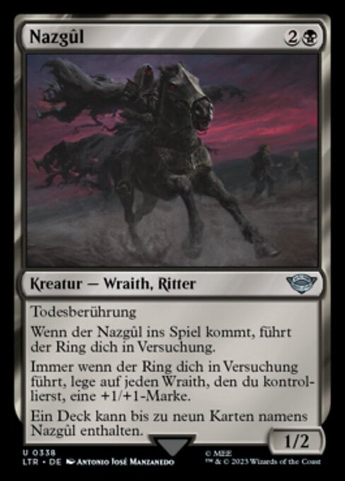 | Rules | Deathtouch When Nazgûl enters the battlefield, the Ring tempts you. Whenever the Ring tempts you, put a +1/+1 counter on each Wraith you control. A deck can have up to nine cards named Nazgûl. |