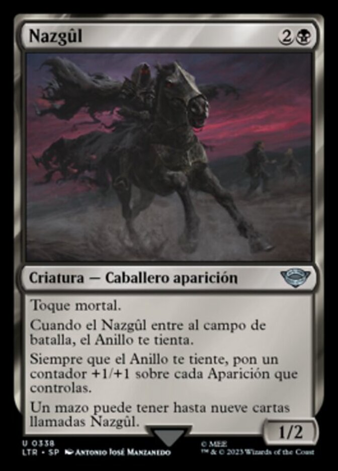 | Rules | Deathtouch When Nazgûl enters the battlefield, the Ring tempts you. Whenever the Ring tempts you, put a +1/+1 counter on each Wraith you control. A deck can have up to nine cards named Nazgûl. |