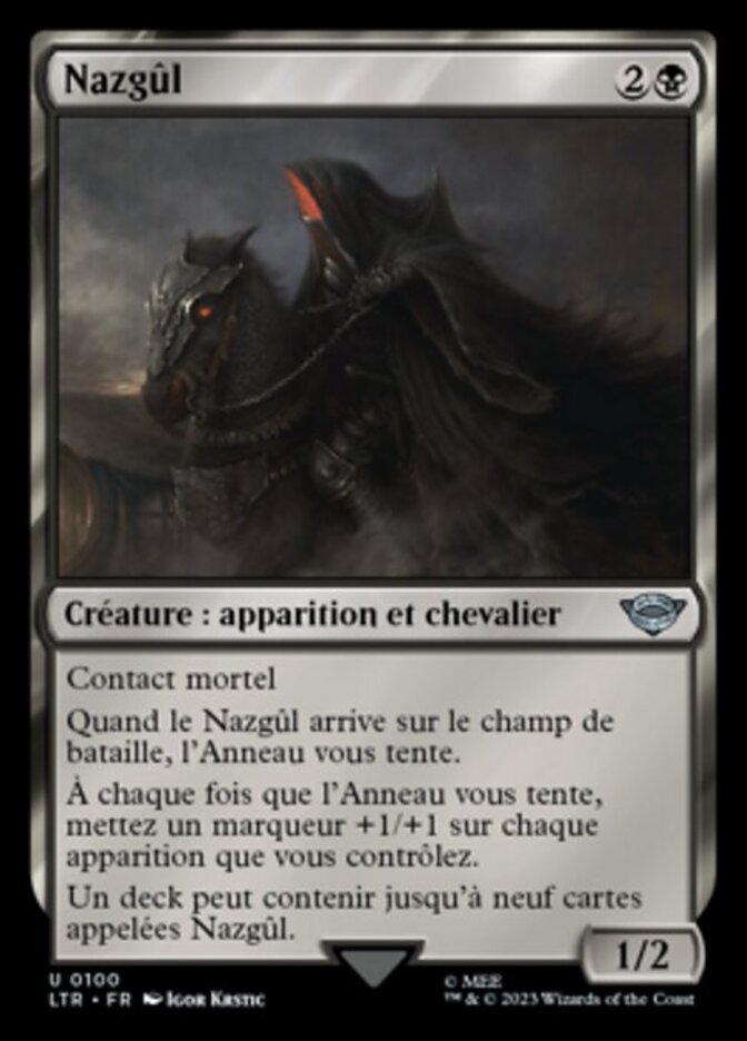 | Rules | Deathtouch When Nazgûl enters the battlefield, the Ring tempts you. Whenever the Ring tempts you, put a +1/+1 counter on each Wraith you control. A deck can have up to nine cards named Nazgûl. |