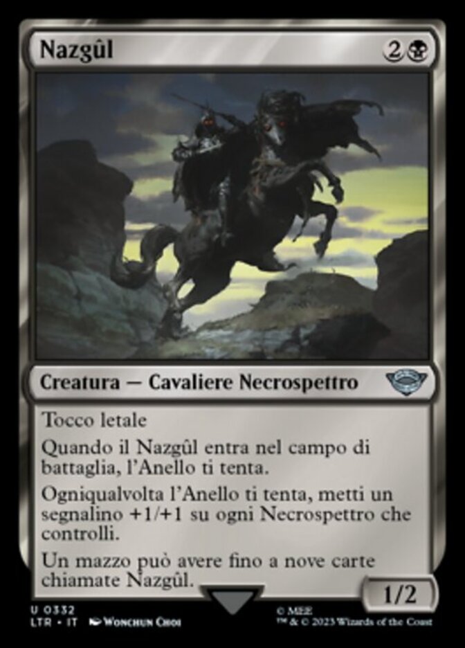 | Rules | Deathtouch When Nazgûl enters the battlefield, the Ring tempts you. Whenever the Ring tempts you, put a +1/+1 counter on each Wraith you control. A deck can have up to nine cards named Nazgûl. |