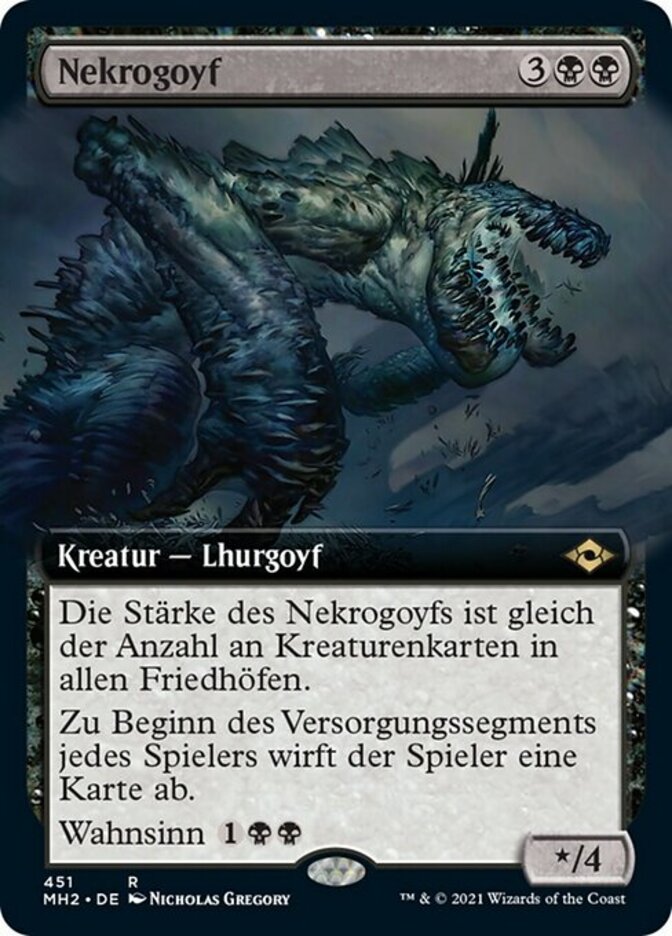 | Rules | Necrogoyf's power is equal to the number of creature cards in all graveyards. At the beginning of each player's upkeep, that player discards a card. Madness (If you discard this card, discard it into exile. When you do, cast it for its madness cost or put it into your graveyard.) |