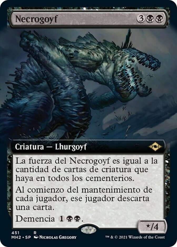 | Rules | Necrogoyf's power is equal to the number of creature cards in all graveyards. At the beginning of each player's upkeep, that player discards a card. Madness (If you discard this card, discard it into exile. When you do, cast it for its madness cost or put it into your graveyard.) |