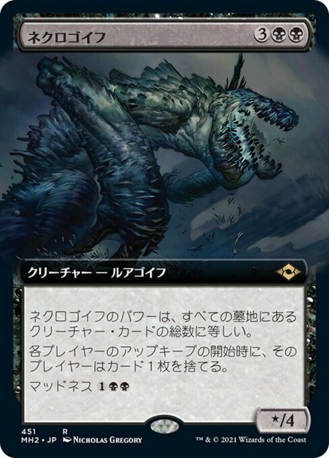 | Rules | Necrogoyf's power is equal to the number of creature cards in all graveyards. At the beginning of each player's upkeep, that player discards a card. Madness (If you discard this card, discard it into exile. When you do, cast it for its madness cost or put it into your graveyard.) |
