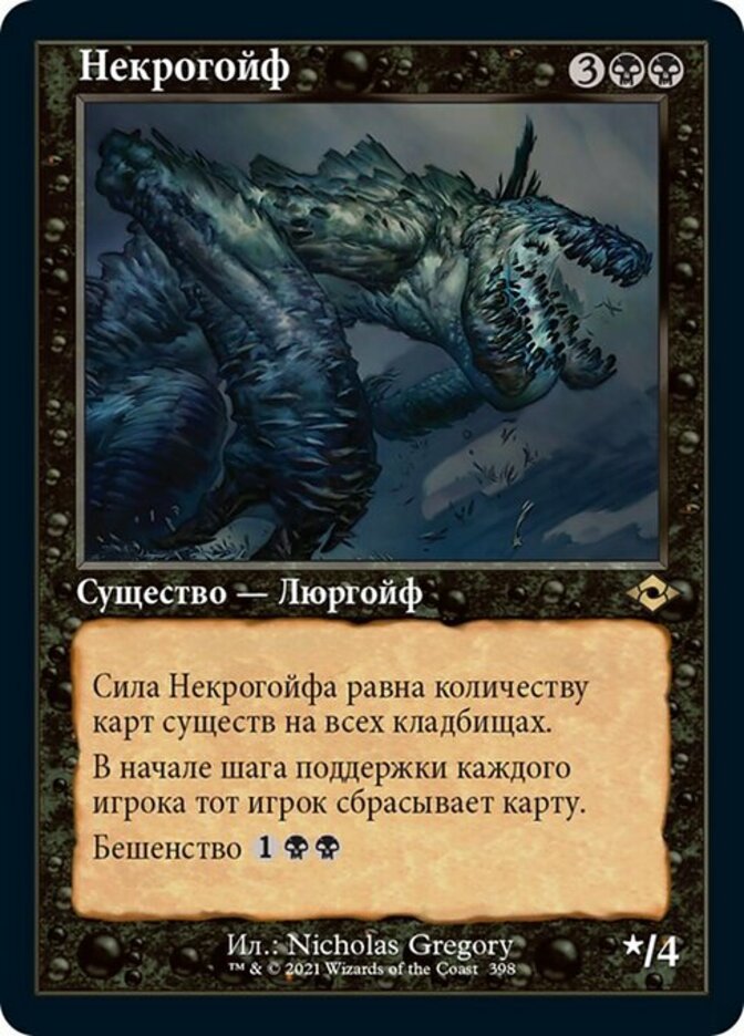 | Rules | Necrogoyf's power is equal to the number of creature cards in all graveyards. At the beginning of each player's upkeep, that player discards a card. Madness (If you discard this card, discard it into exile. When you do, cast it for its madness cost or put it into your graveyard.) |