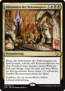| Rules | When Necromancer's Covenant enters the battlefield, exile all creature cards from target player's graveyard, then create a 2/2 black Zombie creature token for each card exiled this way. Zombies you control have lifelink. |