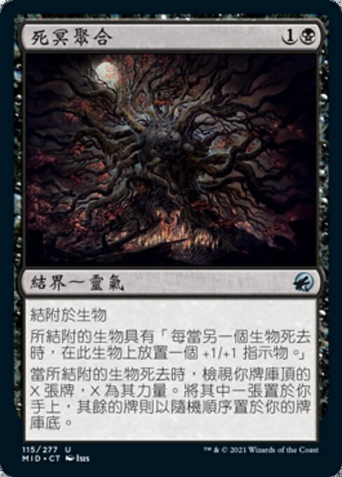 | Rules | Enchant creature Enchanted creature has "Whenever another creature dies, put a +1/+1 counter on this creature." When enchanted creature dies, look at the top X cards of your library, where X is its power. Put one of those cards into your hand and the rest on the bottom of your library in a random order. |