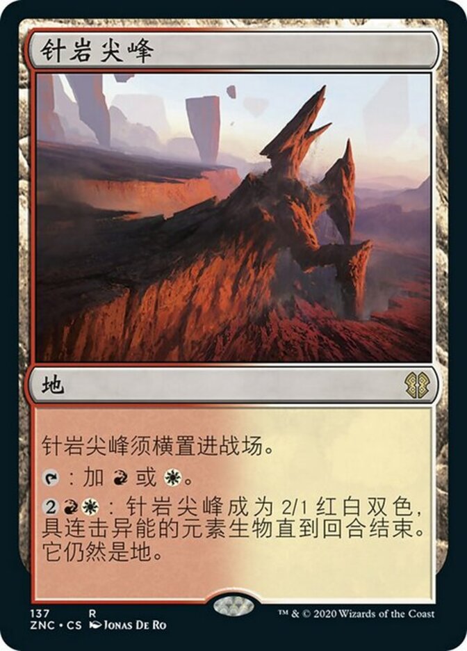 | Rules | Needle Spires enters the battlefield tapped. : Add or . : Needle Spires becomes a 2/1 red and white Elemental creature with double strike until end of turn. It's still a land. |