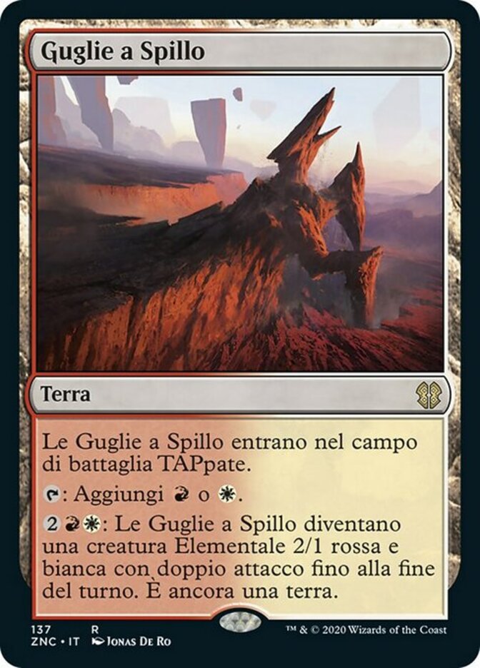 | Rules | Needle Spires enters the battlefield tapped. : Add or . : Needle Spires becomes a 2/1 red and white Elemental creature with double strike until end of turn. It's still a land. |
