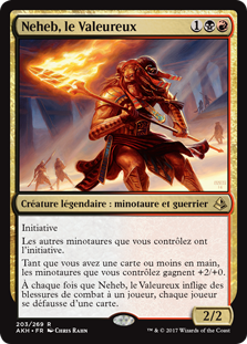 | Rules | First strike Other Minotaurs you control have first strike. As long as you have one or fewer cards in hand, Minotaurs you control get +2/+0. Whenever Neheb, the Worthy deals combat damage to a player, each player discards a card. |