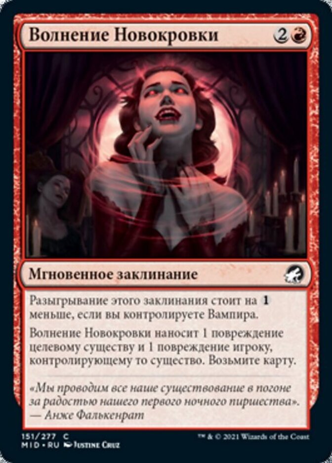 | Rules | This spell costs less to cast if you control a Vampire. Neonate's Rush deals 1 damage to target creature and 1 damage to its controller. Draw a card. |