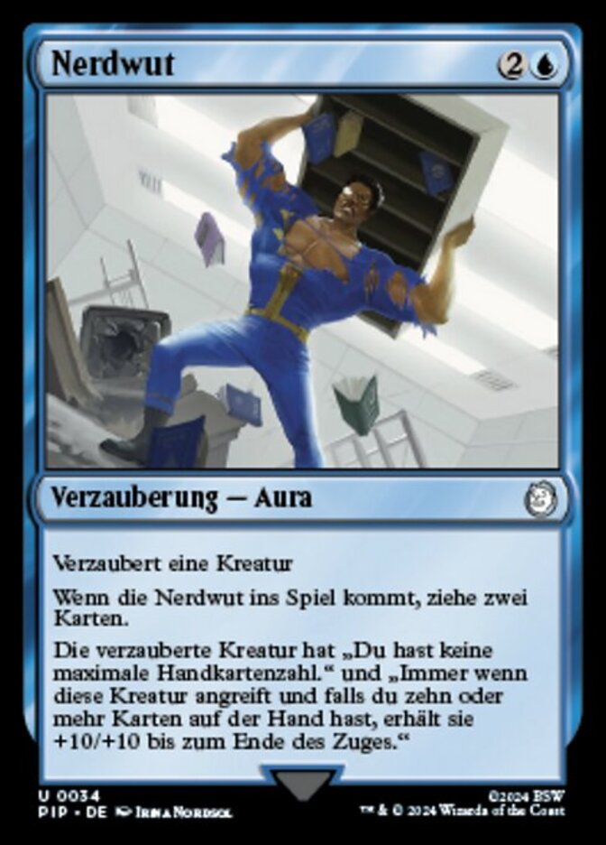 | Rules | Enchant creature When Nerd Rage enters the battlefield, draw two cards. Enchanted creature has "You have no maximum hand size" and "Whenever this creature attacks, if you have ten or more cards in hand, it gets +10/+10 until end of turn." |