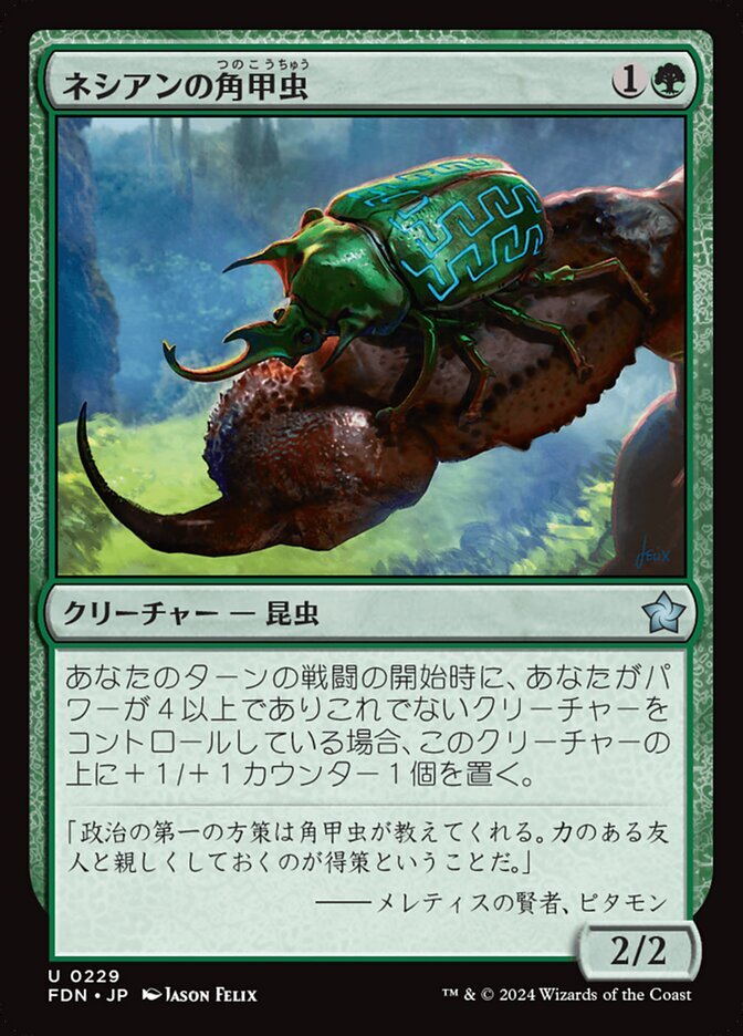 | Rules | At the beginning of combat on your turn, if you control another creature with power 4 or greater, put a +1/+1 counter on Nessian Hornbeetle. |