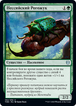 | Rules | At the beginning of combat on your turn, if you control another creature with power 4 or greater, put a +1/+1 counter on Nessian Hornbeetle. |