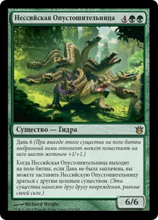 | Rules | Tribute 6 (As this creature enters the battlefield, an opponent of your choice may put six +1/+1 counters on it.) When Nessian Wilds Ravager enters the battlefield, if tribute wasn't paid, you may have Nessian Wilds Ravager fight another target creature. (Each deals damage equal to its power to the other.) |