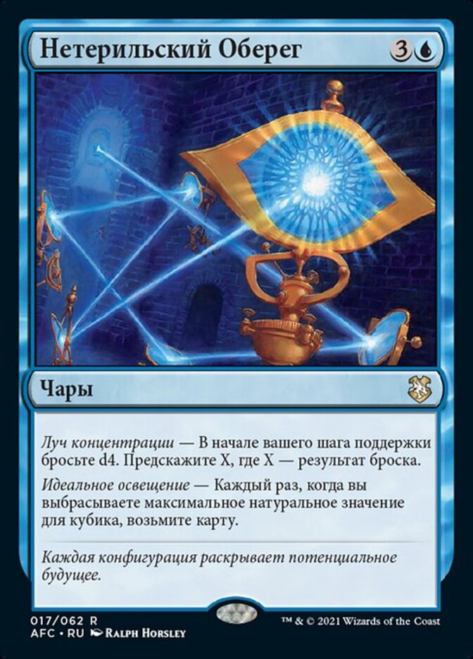 | Rules | Focus Beam — At the beginning of your upkeep, roll a d4. Scry X, where X is the result. Perfect Illumination — Whenever you roll a die's highest natural result, draw a card. |