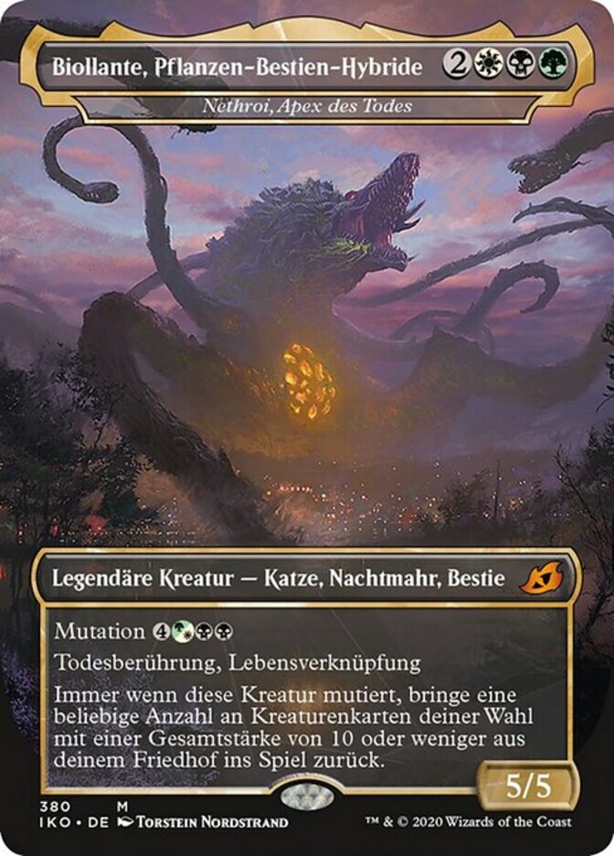 | Rules | Mutate (If you cast this spell for its mutate cost, put it over or under target non-Human creature you own. They mutate into the creature on top plus all abilities from under it.) Deathtouch, lifelink Whenever this creature mutates, return any number of target creature cards with total power 10 or less from your graveyard to the battlefield. |
