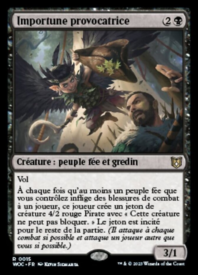 | Rules | Flying Whenever one or more Faeries you control deal combat damage to a player, that player creates a 4/2 red Pirate creature token with "This creature can't block." The token is goaded for the rest of the game. (It attacks each combat if able and attacks a player other than you if able.) |