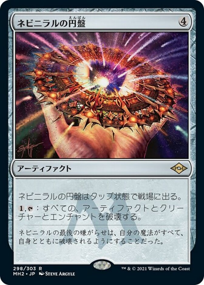 | Rules | Nevinyrral's Disk enters the battlefield tapped. , : Destroy all artifacts, creatures, and enchantments. |