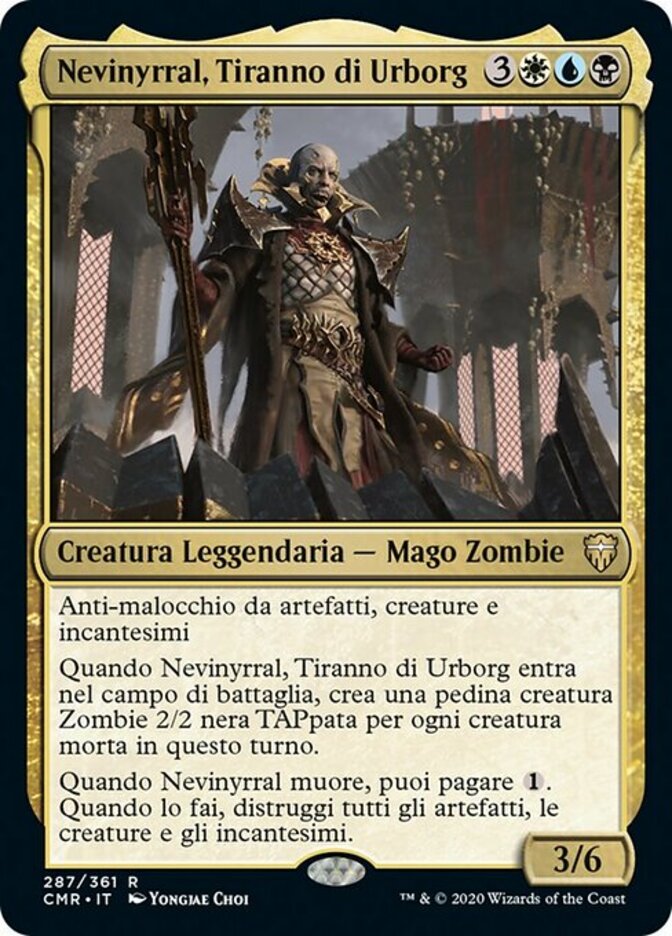 | Rules | Hexproof from artifacts, creatures, and enchantments When Nevinyrral, Urborg Tyrant enters the battlefield, create a tapped 2/2 black Zombie creature token for each creature that died this turn. When Nevinyrral dies, you may pay . When you do, destroy all artifacts, creatures, and enchantments. |