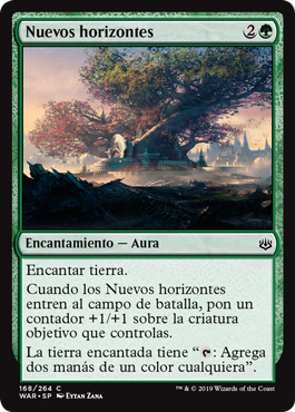 | Rules | Enchant land When New Horizons enters the battlefield, put a +1/+1 counter on target creature you control. Enchanted land has ": Add two mana of any one color." |