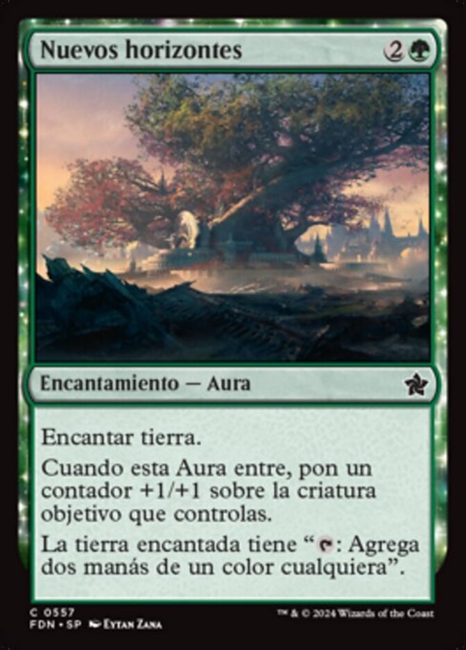 | Rules | Enchant land When New Horizons enters the battlefield, put a +1/+1 counter on target creature you control. Enchanted land has ": Add two mana of any one color." |