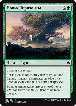 | Rules | Enchant land When New Horizons enters the battlefield, put a +1/+1 counter on target creature you control. Enchanted land has ": Add two mana of any one color." |
