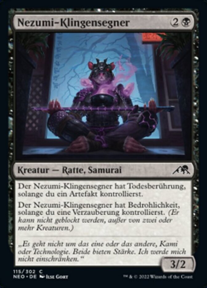 | Rules | Nezumi Bladeblesser has deathtouch as long as you control an artifact. Nezumi Bladeblesser has menace as long as you control an enchantment. (It can't be blocked except by two or more creatures.) |