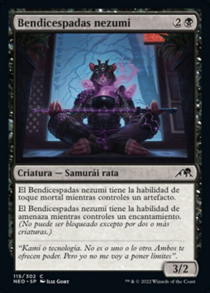 | Rules | Nezumi Bladeblesser has deathtouch as long as you control an artifact. Nezumi Bladeblesser has menace as long as you control an enchantment. (It can't be blocked except by two or more creatures.) |