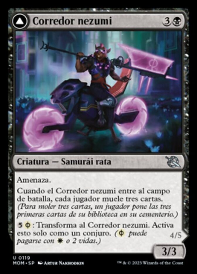 | Rules | Menace When Nezumi Freewheeler enters the battlefield, each player mills three cards. (To mill a card, put the top card of your library into your graveyard.) : Transform Nezumi Freewheeler. Activate only as a sorcery. ( can be paid with either or 2 life.) // Menace (This creature can't be blocked except by two or more creatures.) When this creature transforms into Hideous Fleshwheeler, put target permanent card with mana value 2 or less from a graveyard onto the battlefield under your control. |