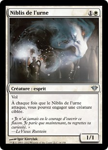 | Rules | Flying Whenever Niblis of the Urn attacks, you may tap target creature. |