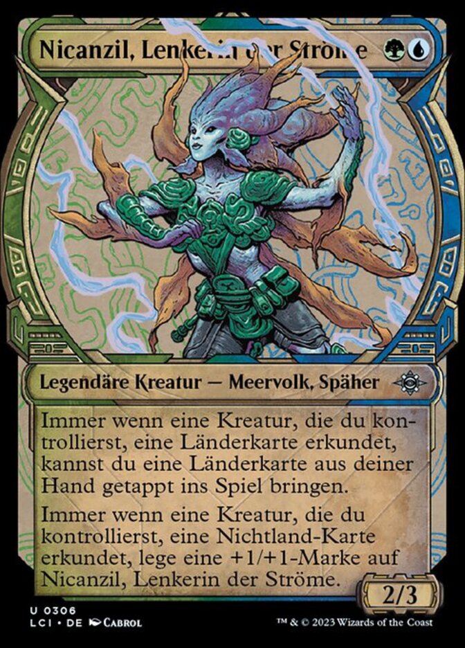 | Rules | Whenever a creature you control explores a land card, you may put a land card from your hand onto the battlefield tapped. Whenever a creature you control explores a nonland card, put a +1/+1 counter on Nicanzil, Current Conductor. |