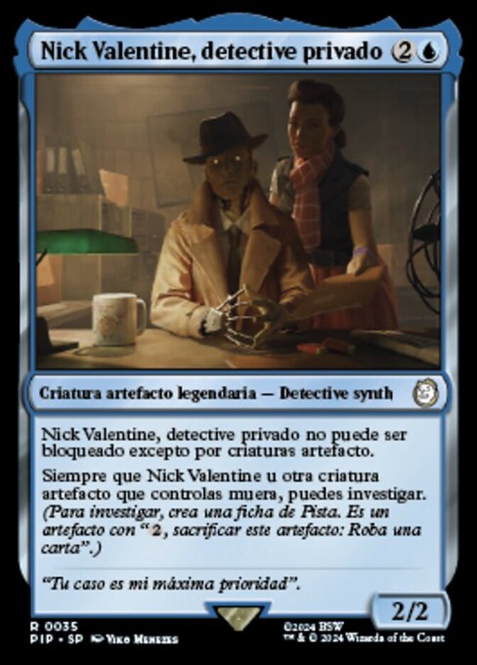 | Rules | Nick Valentine, Private Eye can't be blocked except by artifact creatures. Whenever Nick Valentine or another artifact creature you control dies, you may investigate. (To investigate, create a Clue token. It's an artifact with ", Sacrifice this artifact: Draw a card.") |