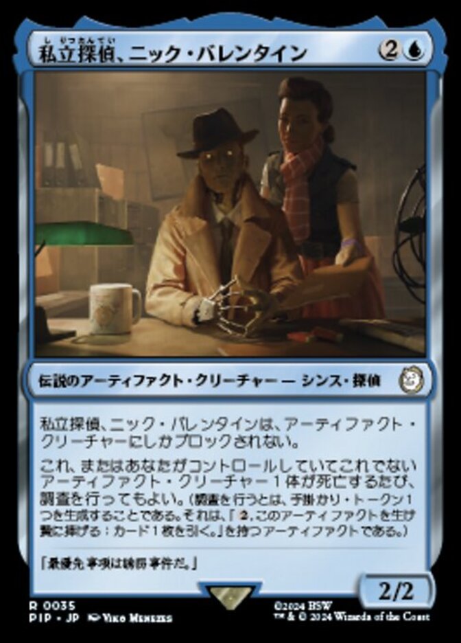 | Rules | Nick Valentine, Private Eye can't be blocked except by artifact creatures. Whenever Nick Valentine or another artifact creature you control dies, you may investigate. (To investigate, create a Clue token. It's an artifact with ", Sacrifice this artifact: Draw a card.") |