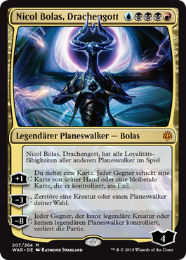 | Rules | Nicol Bolas, Dragon-God has all loyalty abilities of all other planeswalkers on the battlefield. +1: You draw a card. Each opponent exiles a card from their hand or a permanent they control. −3: Destroy target creature or planeswalker. −8: Each opponent who doesn't control a legendary creature or planeswalker loses the game. |