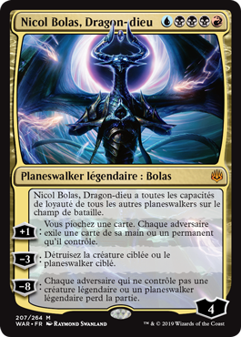 | Rules | Nicol Bolas, Dragon-God has all loyalty abilities of all other planeswalkers on the battlefield. +1: You draw a card. Each opponent exiles a card from their hand or a permanent they control. −3: Destroy target creature or planeswalker. −8: Each opponent who doesn't control a legendary creature or planeswalker loses the game. |