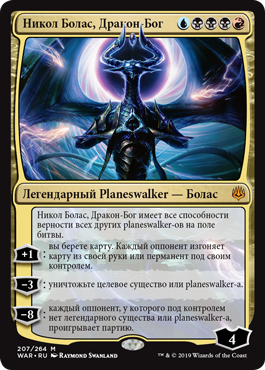 | Rules | Nicol Bolas, Dragon-God has all loyalty abilities of all other planeswalkers on the battlefield. +1: You draw a card. Each opponent exiles a card from their hand or a permanent they control. −3: Destroy target creature or planeswalker. −8: Each opponent who doesn't control a legendary creature or planeswalker loses the game. |