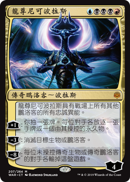| Rules | Nicol Bolas, Dragon-God has all loyalty abilities of all other planeswalkers on the battlefield. +1: You draw a card. Each opponent exiles a card from their hand or a permanent they control. −3: Destroy target creature or planeswalker. −8: Each opponent who doesn't control a legendary creature or planeswalker loses the game. |