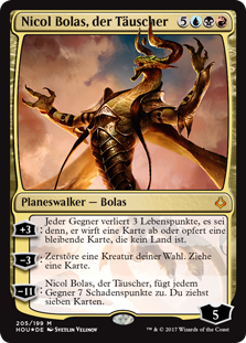 | Rules | +3: Each opponent loses 3 life unless that player sacrifices a nonland permanent or discards a card. −3: Destroy target creature. Draw a card. −11: Nicol Bolas, the Deceiver deals 7 damage to each opponent. You draw seven cards. |